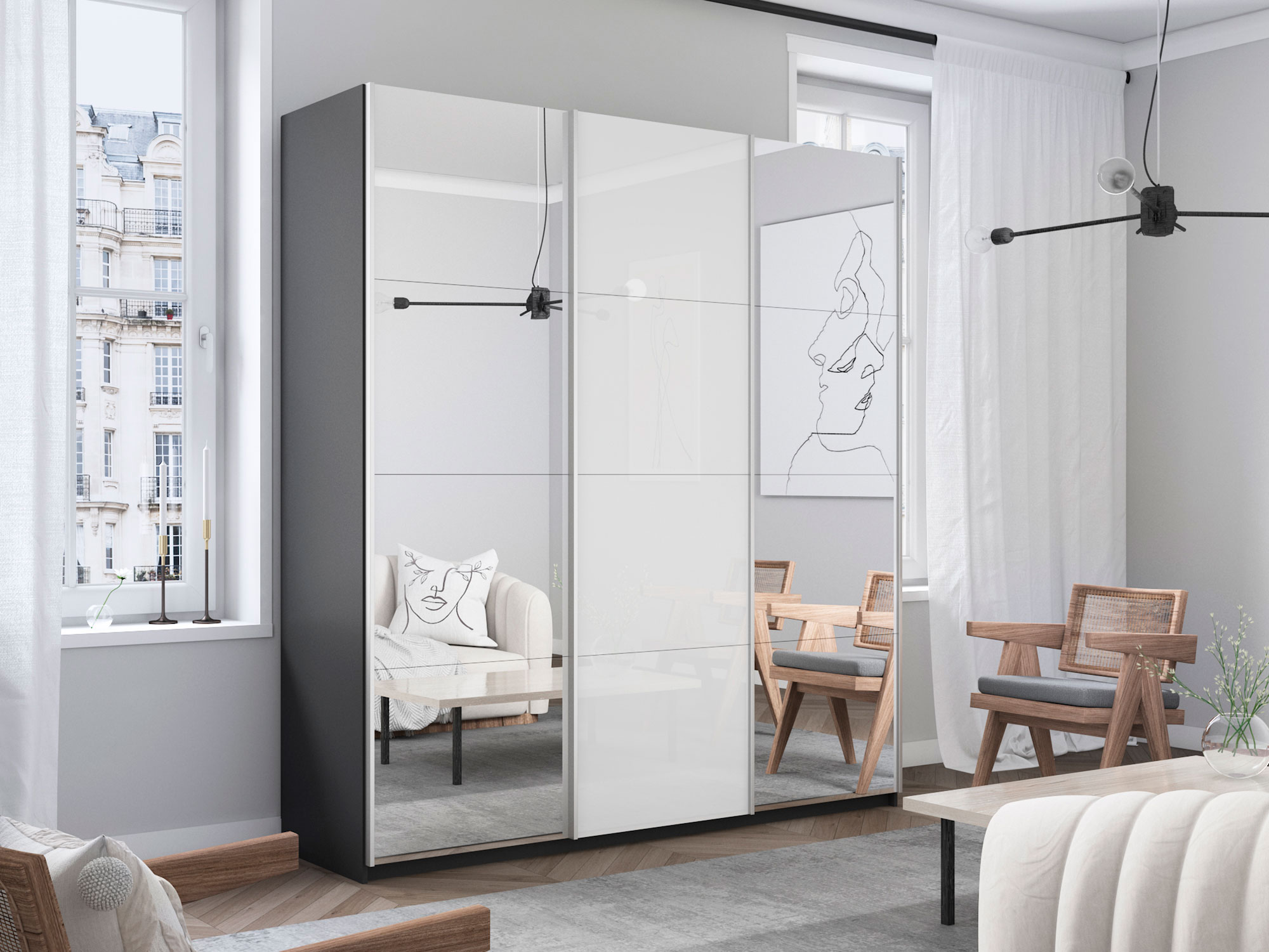 Шкаф-купе Прайм 3-х дверный 2100 Зеркало/Стекло Белое/Зеркало Серый Диамант